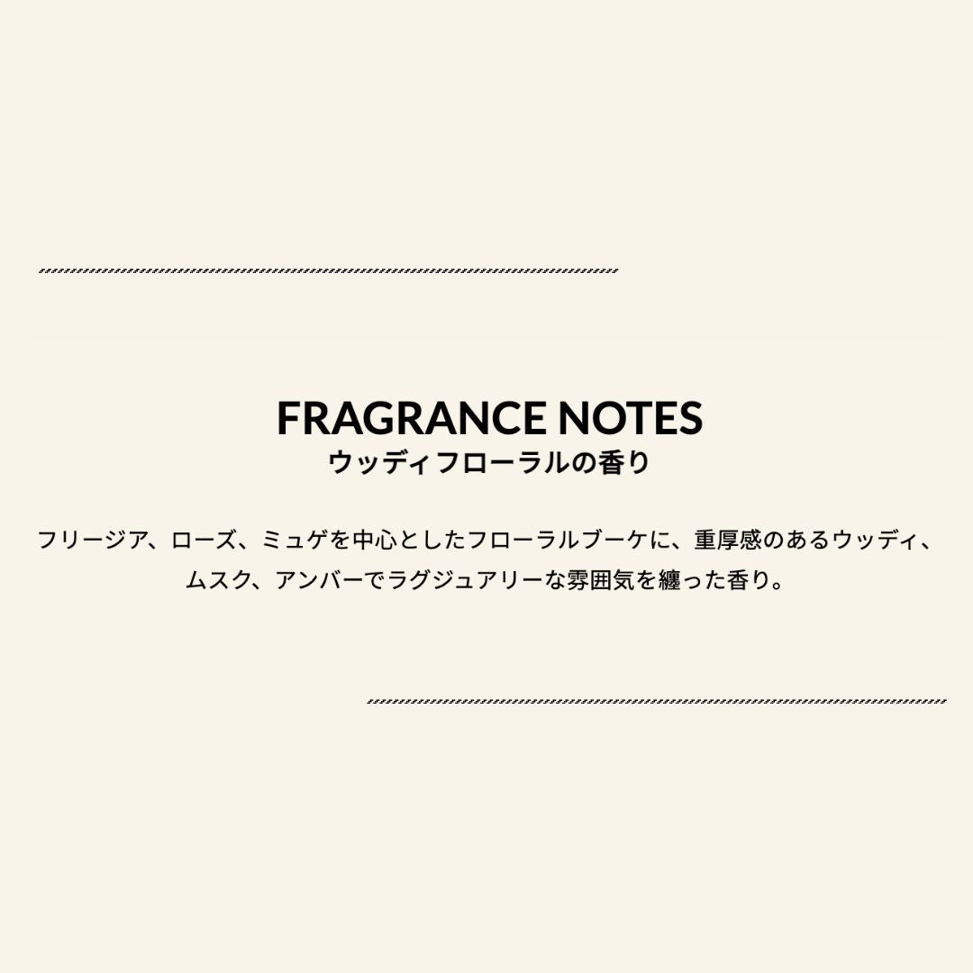 フリージア、ローズ、ミュゲを中心としたフローラルブーケに、重厚感のあるウッディ、ムスク、アンバーでラグジュアリーな雰囲気を纏った香り。