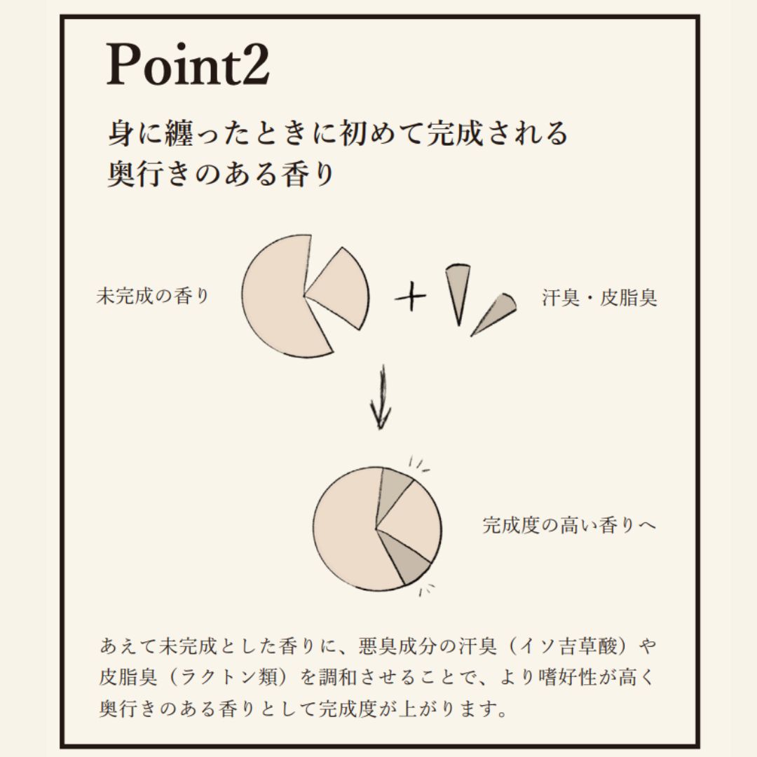 ベルガモット、ラベンダーのフレッシュなトップノートにピンクペッパー、ムスク、パロサント、アンバーを加えて深みを持たせた、大人の色気を感じさせる妖艶なスパイシーウッドの香り。