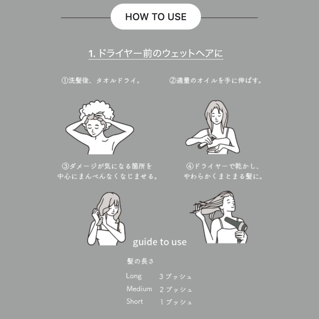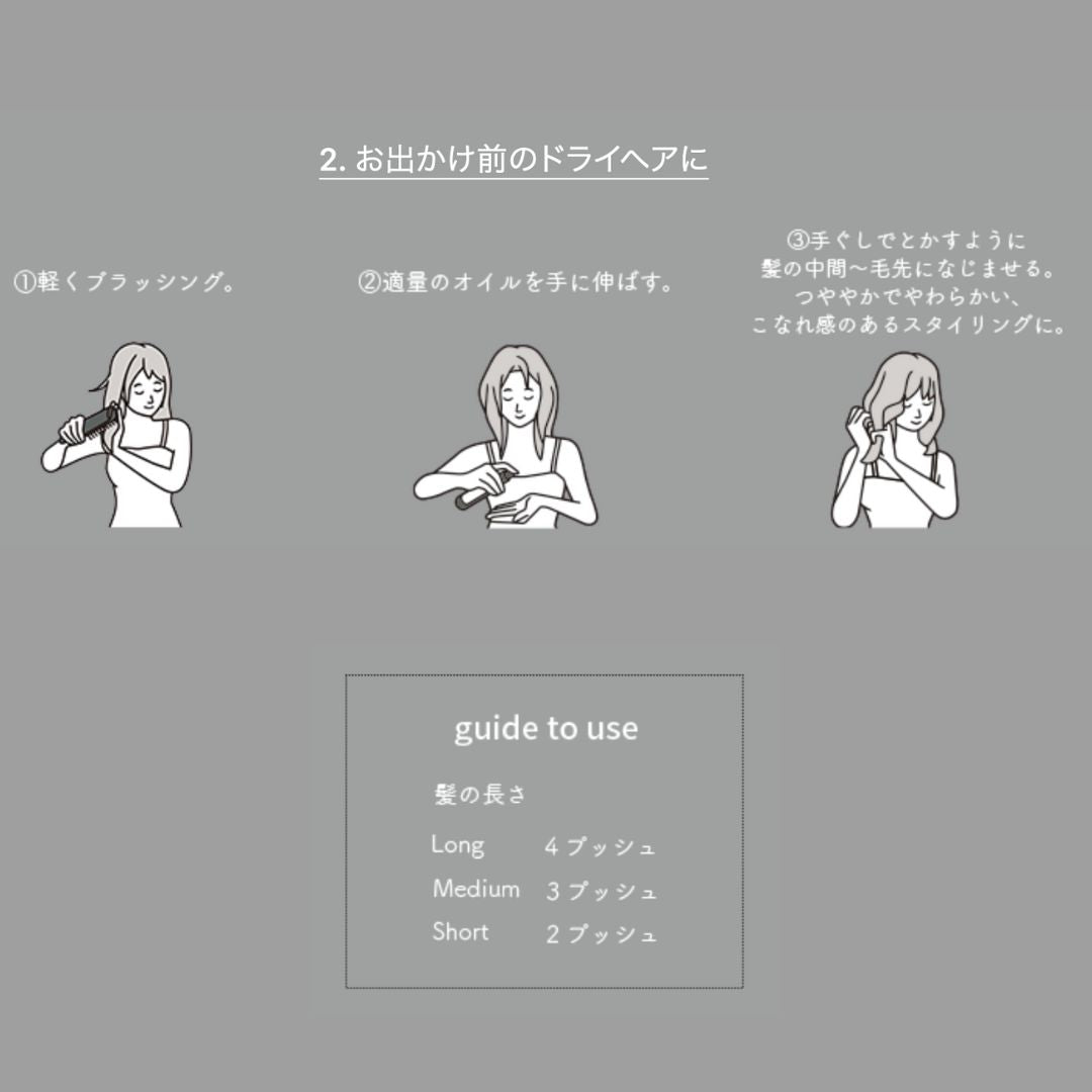 アウトバスオイルとしてはもちろん、ヘアスタイリングやフレグランスとしてもご使用いただけます。