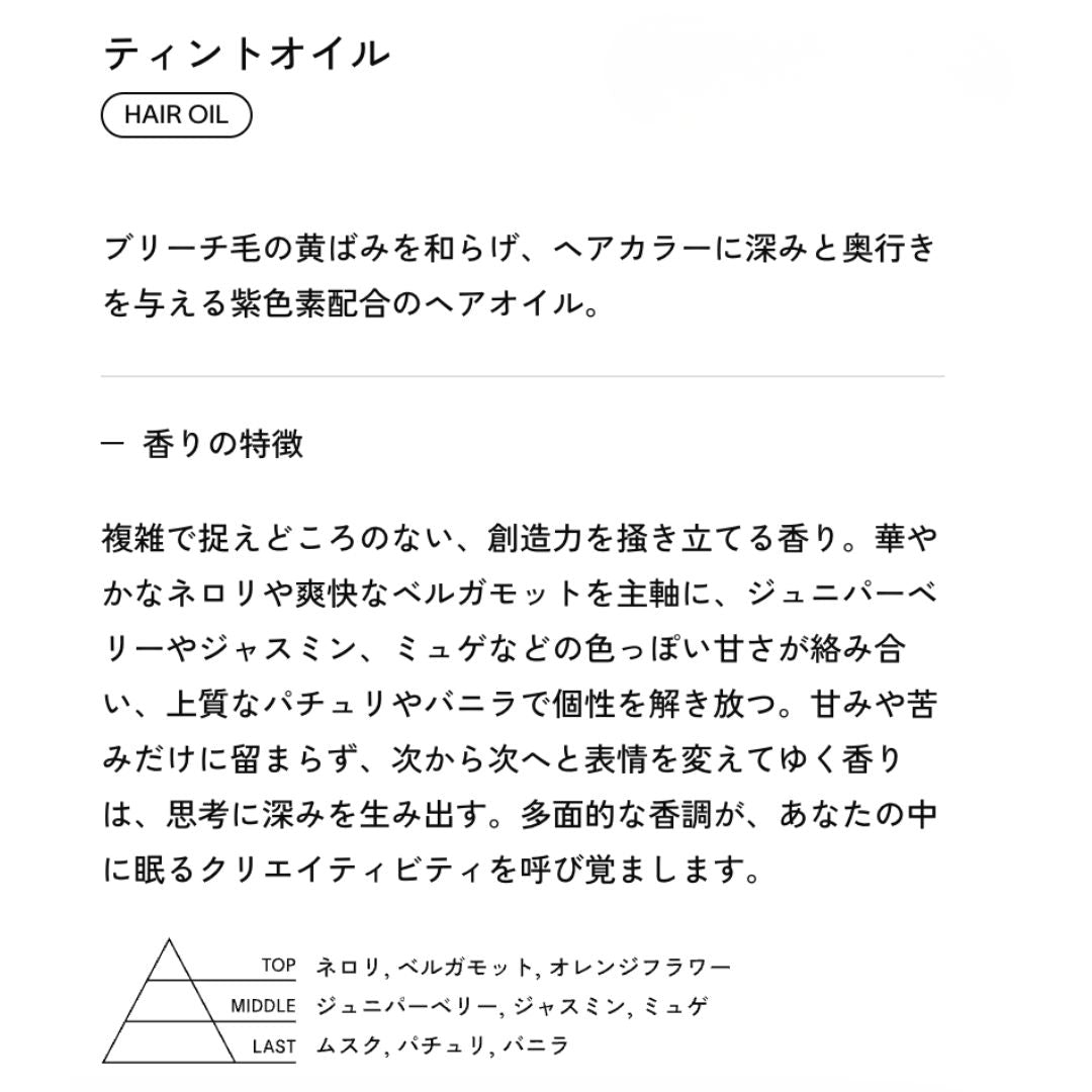 ブリーチ毛の黄ばみを和らげ、ヘアカラーに深みと奥行きを与える紫色素配合のヘアオイル。